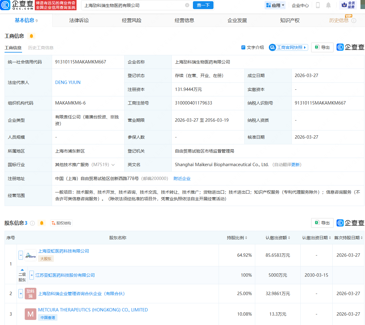 近日,上海劢科瑞生物医药有限公司成立,法定代表人为DENGYIJUN,经营范围包含:货物进出口;技术进出口;知识产权服务(专利代理服务除外)等。企查查股权穿透显示,该公司由亚虹医药(688176)全资子公司上海亚虹医药科技有限公司、上海劢科瑞企业管理咨询合伙企业(有限合伙)等共同持股。